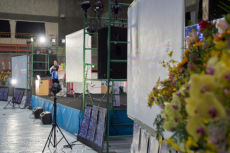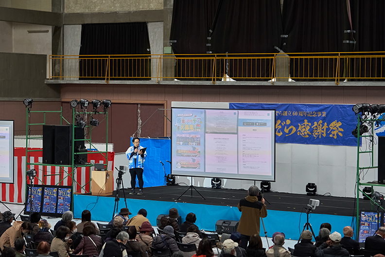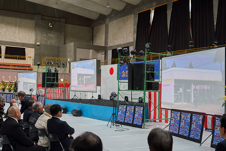企画管理課・園田が司会を務め、ステージ正面と左右に配された計3枚の大型スクリーンが連動。ダイナミックな映像演出が、会場の期待感をいっそう引き立てました。