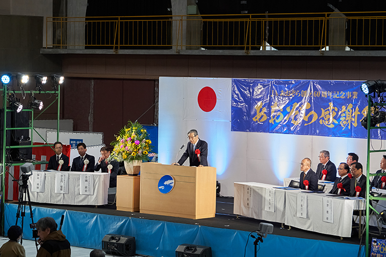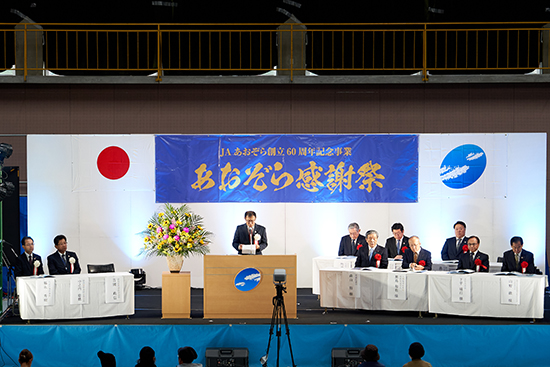 主催者を代表してJAあおぞらの吉國経営管理委員会会長が登壇し、「経営理念である次世代の農業を目指し、開拓者精神で取り組み、地域になくてはならないJAを目指す」と挨拶し、組合員や地域住民の皆様に支えられて60周年を迎えられたことへの深い感謝と、これからのさらなる発展に向けた決意を述べました。