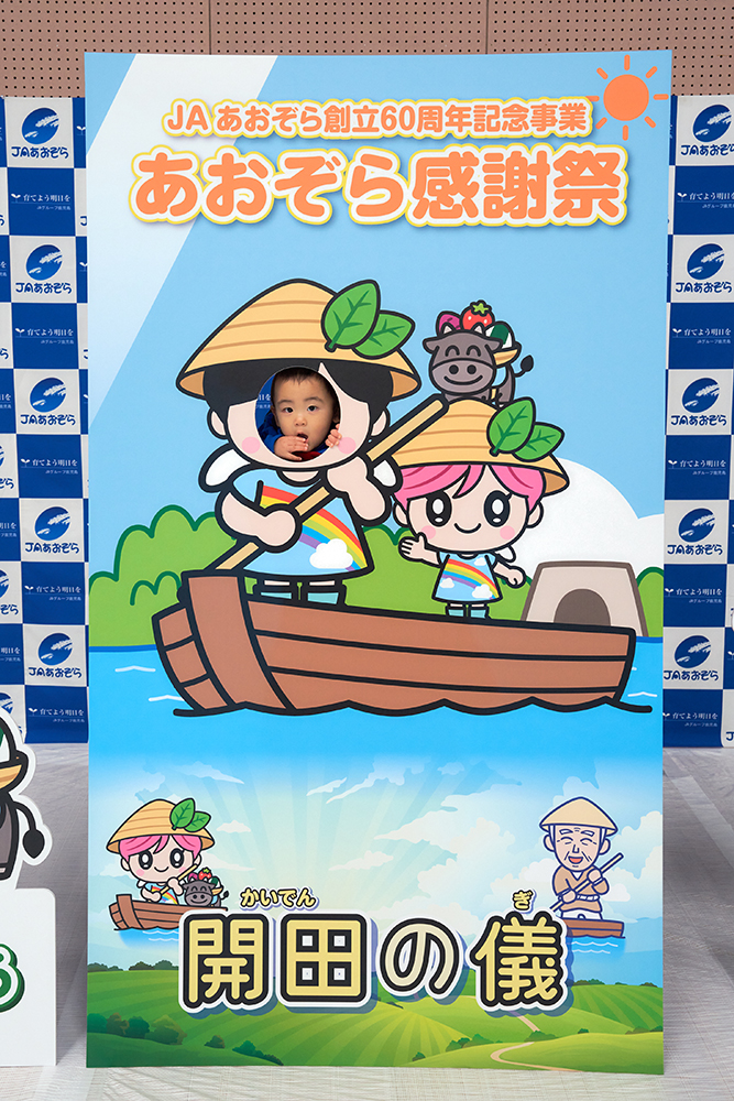 会場後方の特設ブースには、さっそく「あおぞらにじまる」と「モー助」と一緒に記念撮影用ができる「顔はめパネル」が登場。