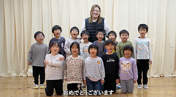 現在、第一線で活躍する職員たちが「次の70年、80年、そして100年」へ意気込む姿や、地域の保育園・小学校の子どもたちからの元気いっぱいの「おめでとう!」というメッセージが映し出されました。